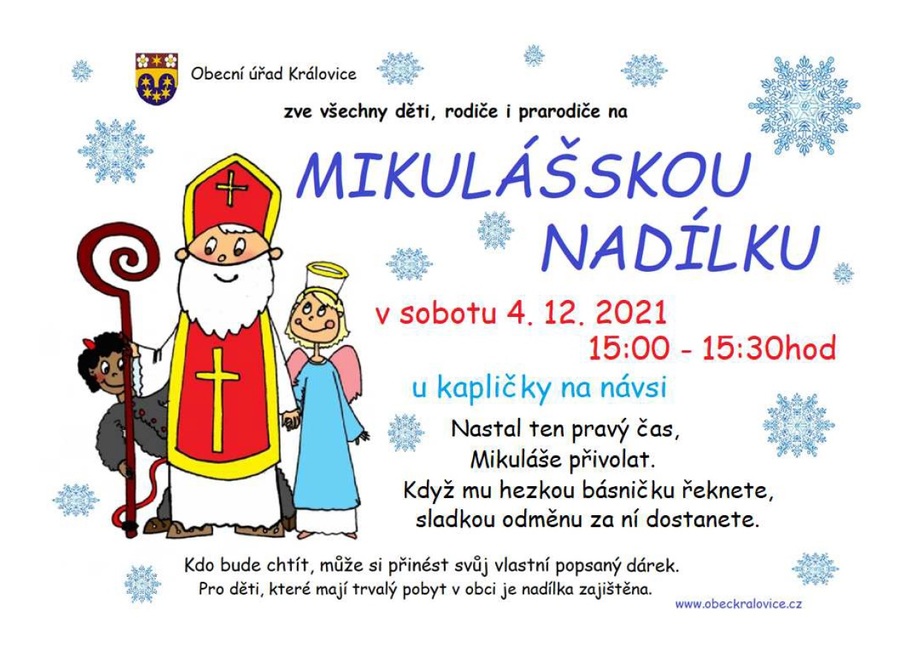 V sobotu 4.12.2021 proběhne od 15,00 do 15,30 Mikulášská nadílka pro děti u kapličky na návsi.