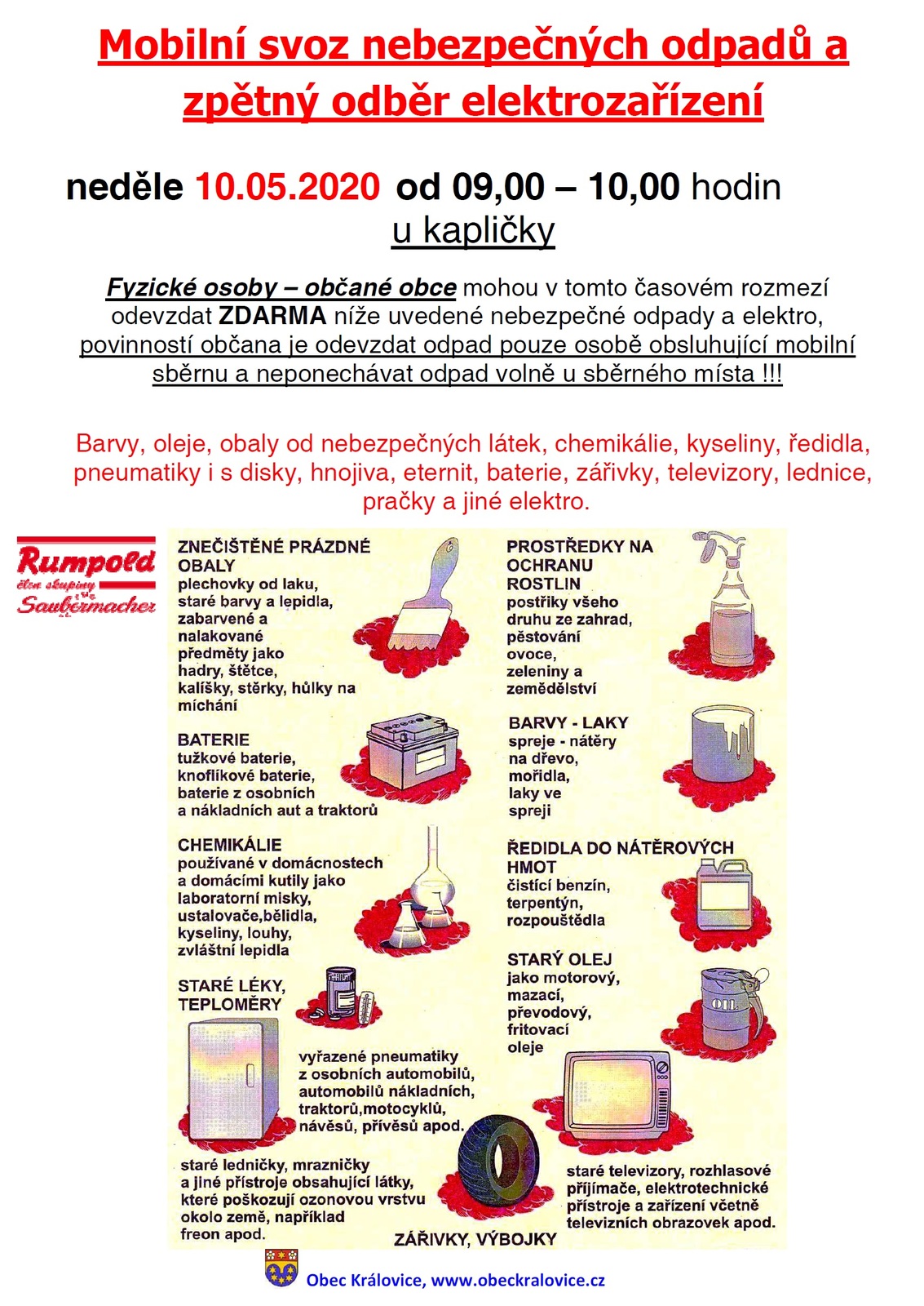 Mobilní svoz nebezpečných odpadů a zpětný odběr elektrozařízení proběhne v obci Královice, u kapličky,  v neděli 10.05.2020 v čase od 09,00 - 10,00 hodin.