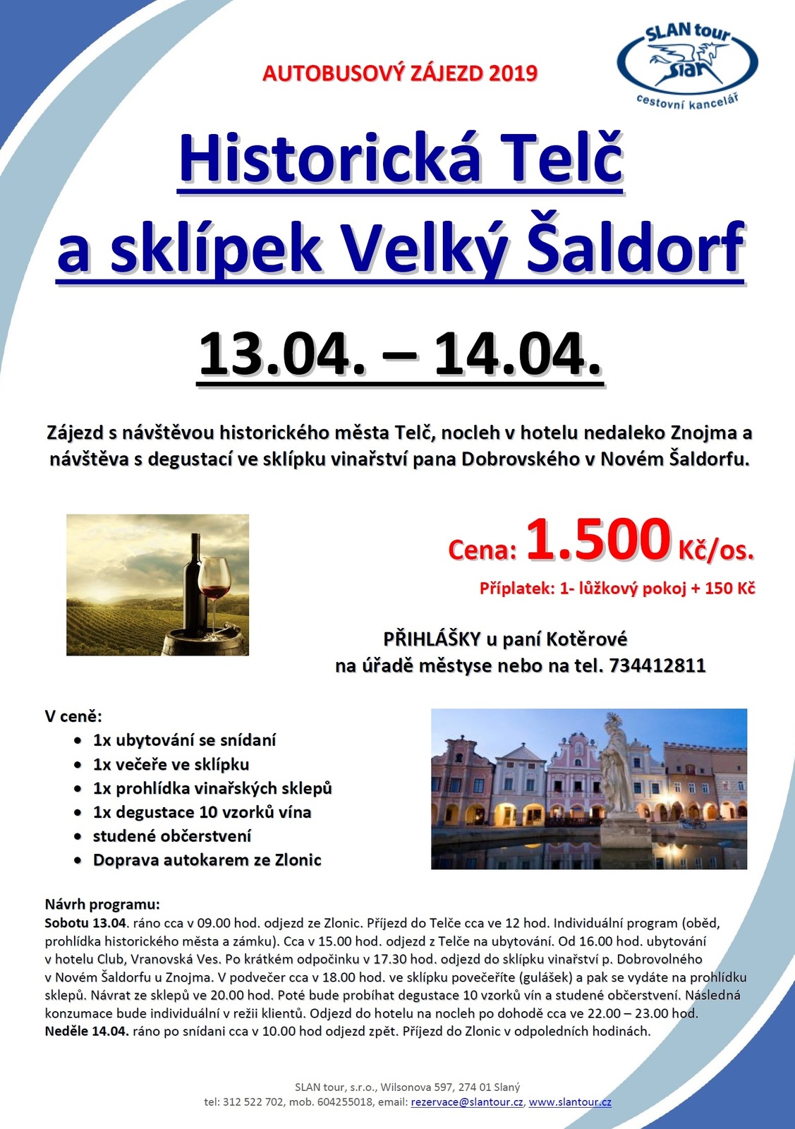 Úvod > Obec > Aktuality > Nabídka zájezdu městyse Zlonice - Historická Telč a sklípek Velký Šaldorf