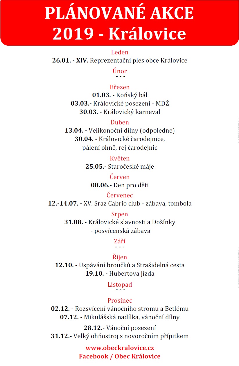 Úvod > Obec > Aktuality > Plánované akce v Královicích v roce 2019