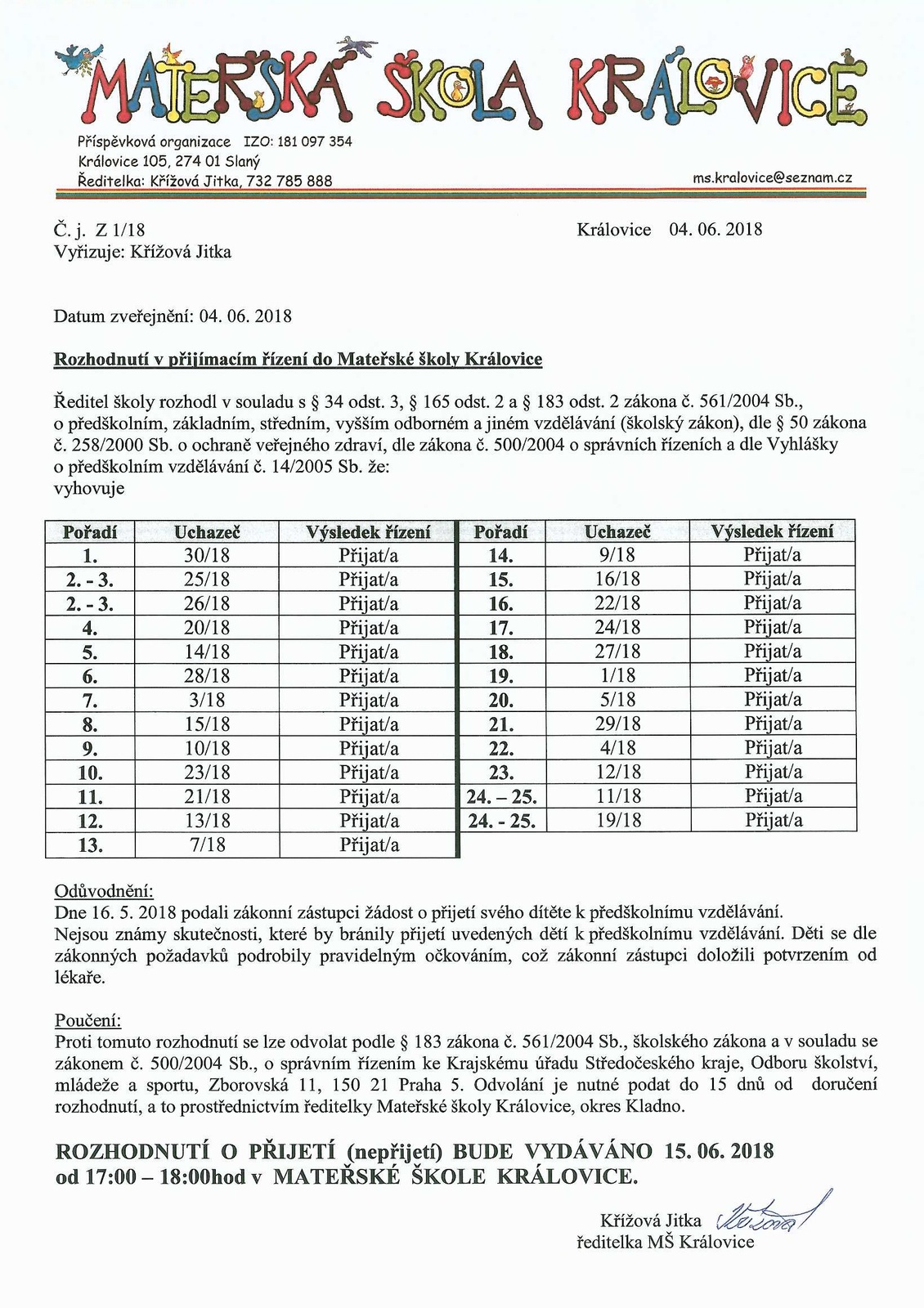 Rozhodnutí v přijímacím řízení do Mateřské školy Královice