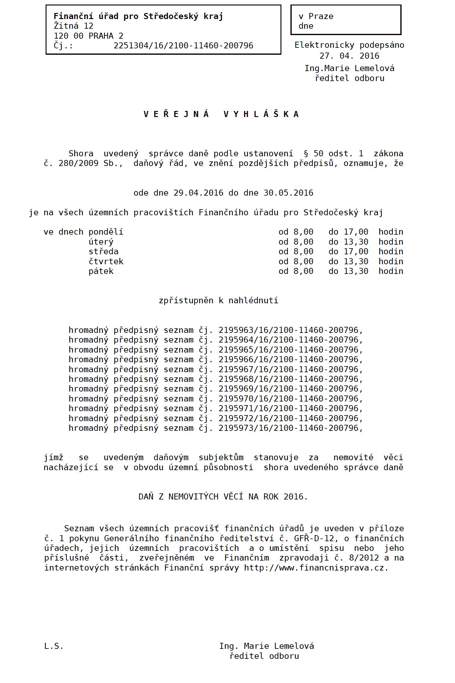 Hromadný předpisný seznam pro daň z nemovitých věcí na rok 2016