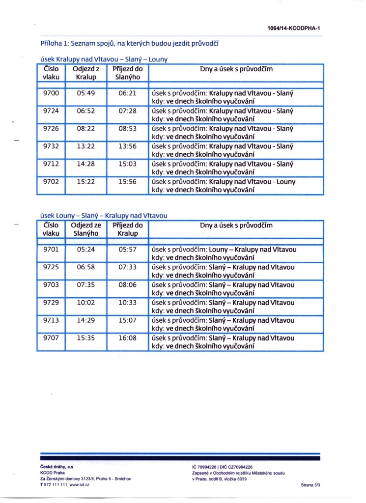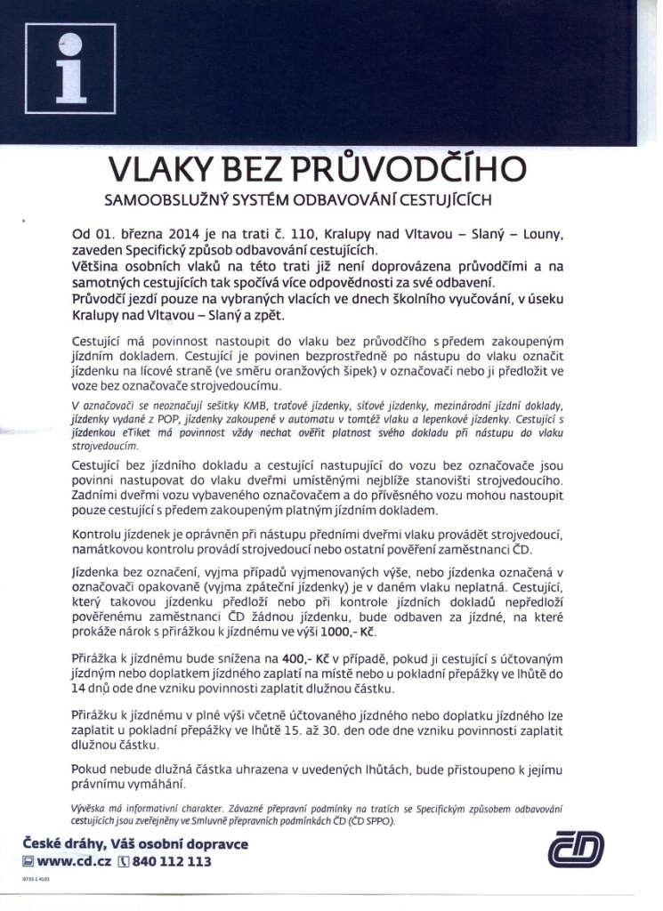 Společnost České dráhy, a.s., zavádí od 01.března 2014 Specifický způsob odbavování cestujích na trati č. 110 Kralupy nad Vltavou-Zvoleněve-Slaný-Louny.