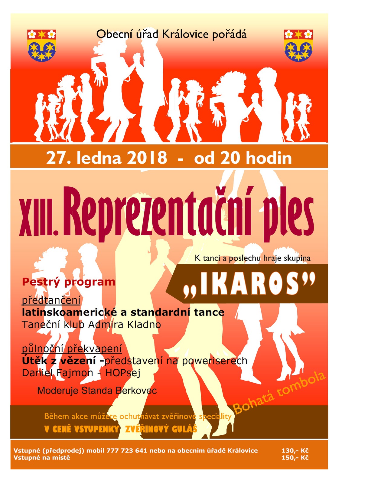 Obecní úřad Královice zve na tradiční reprezentační ples obce, který se koná dne 27.01.2018 od 20,00 hodin na sále královické hospůdky.