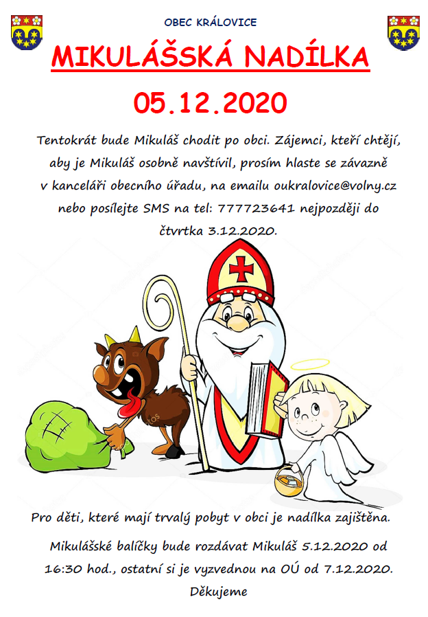 MIKULÁŠSKÁ NADÍLKA PRO DĚTI 5.12.2020 pro děti z obce Královice. Zájemci, kteří mají zájem, aby jejich děti navštívil Mikuláš, prosím hlaste se závazně v kanceláři OÚ, na email oukralovice@volny.cz nebo pište SMS na tel: 777723641 nejpozději do 3.12.2020.