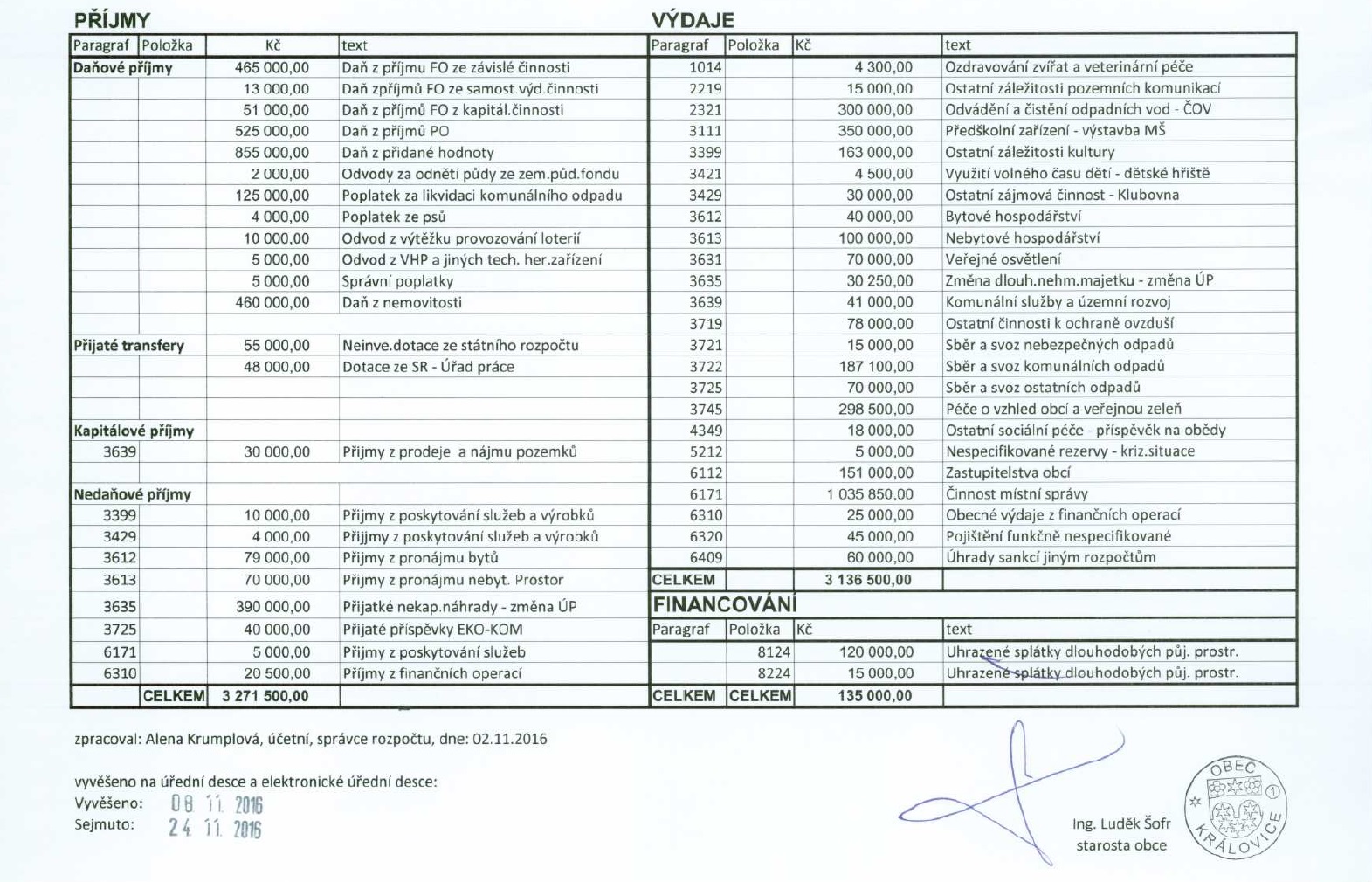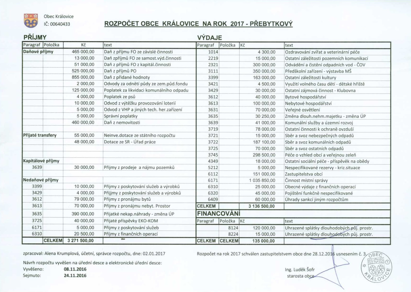 Návrh rozpočtu obce Královice na rok 2017 - přebytkový